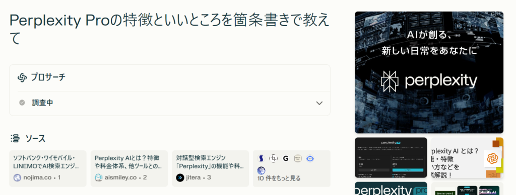 あくまで最新の「検索エンジン」なので、Perplexity Proが向いている仕事は「リサーチ」ということなんですね。