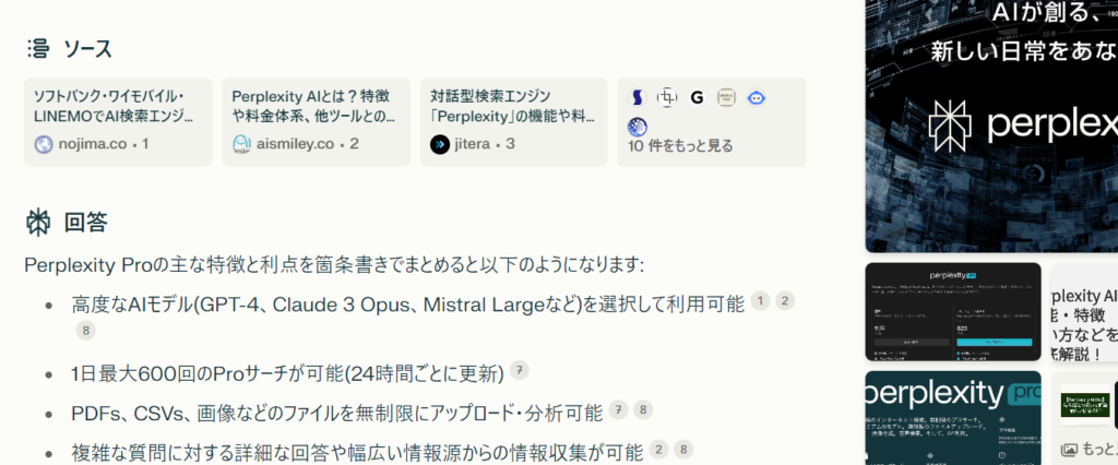 Perplexity Proは、AI搭載の検索エンジン。「検索エンジン」が主体だからこそ、通常のテキスト生成系のAIに比べ、情報ソースをしっかりと表示してくれるのが特徴です。しかも、こちらの質問の意図をくみ取ってくれるので、それがとってもありがたい。
